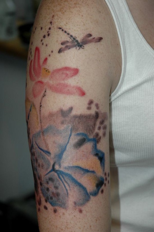 水彩莲花荷叶与蜻蜓手臂纹身图案