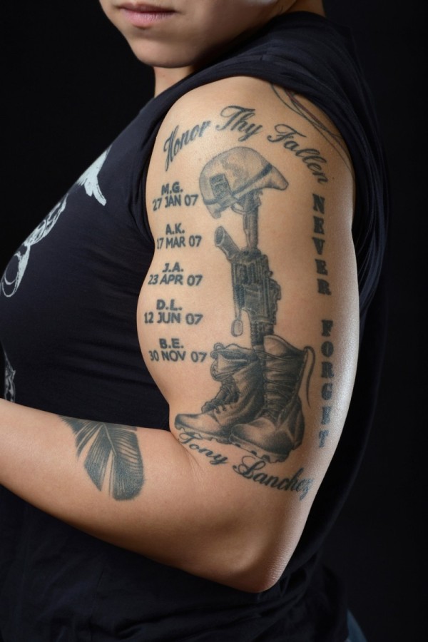 纪念战士的字母和装备手臂纹身图案