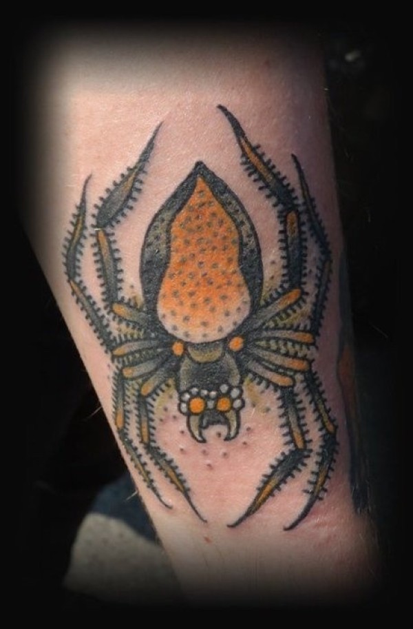 手臂上的黄色蜘蛛纹身图案