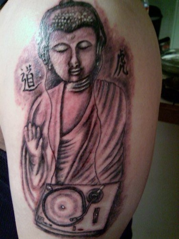 男人大臂留声机和佛像纹身图案