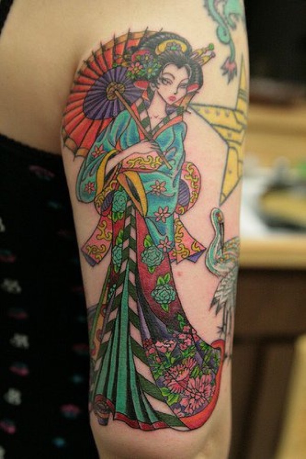 艺妓和星星彩色手臂纹身图案