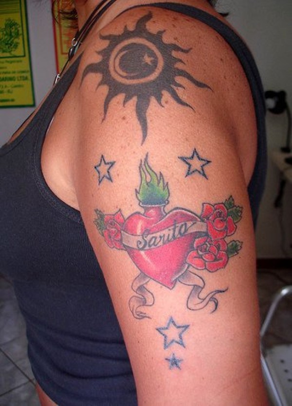 大臂太阳月亮和星星圣心纹身图案