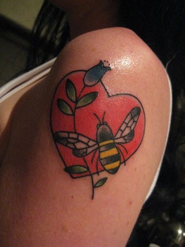 手臂黄色的蜜蜂和心形纹身图案