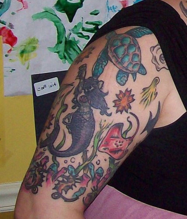 大臂彩色的海底动物美人鱼纹身图案