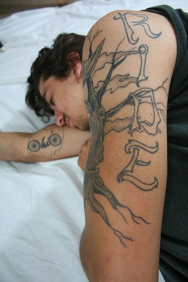 手臂黑灰枯树和字母创意纹身图案