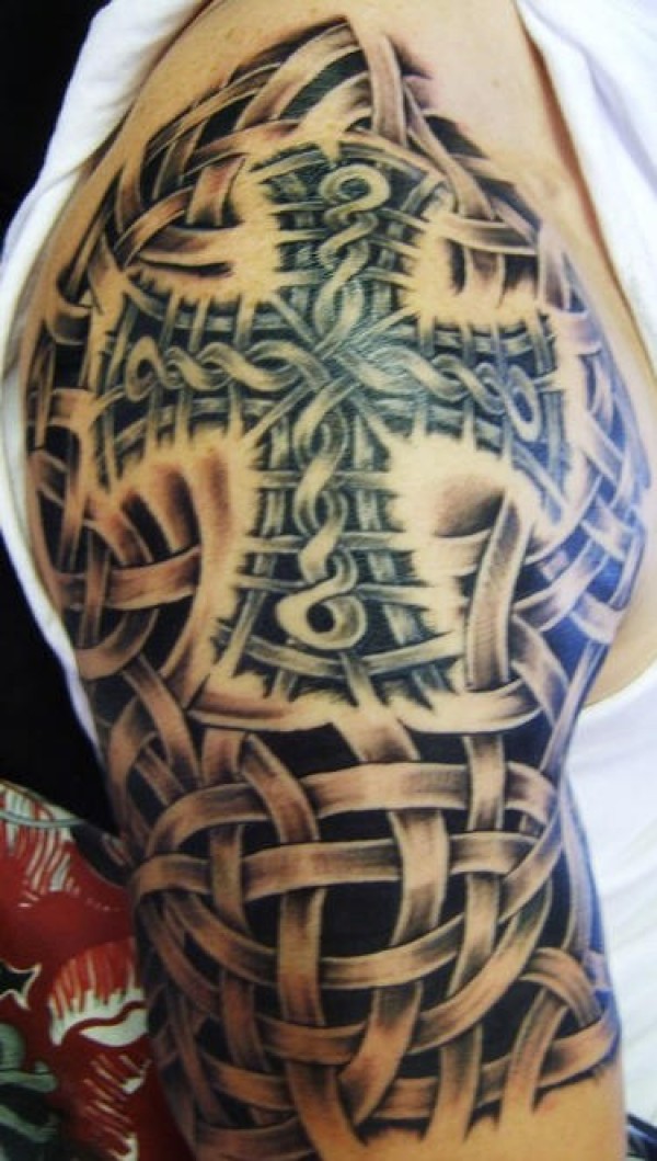 大臂编织十字架和凯尔特结纹身图案