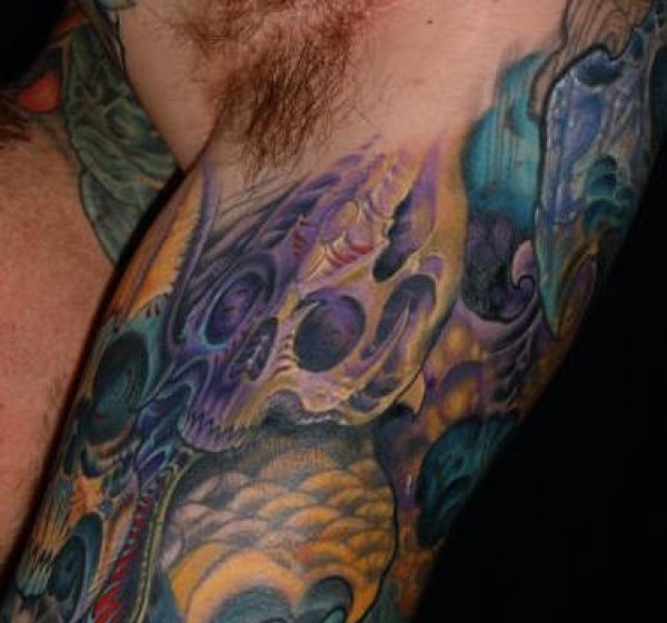 大臂七彩的机械骷髅纹身图案