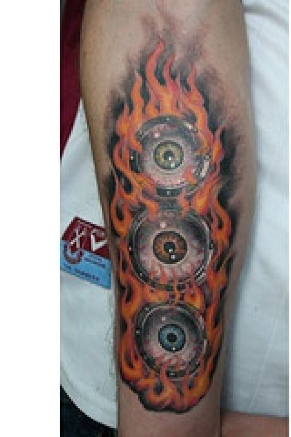 手臂火焰和彩色眼球纹身图案
