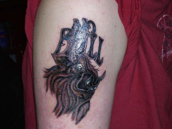 手臂上愤怒的毛牛纹身图案