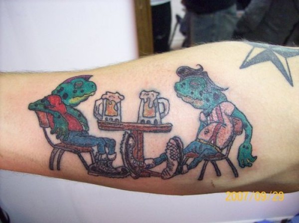 青蛙在喝啤酒彩色胳膊纹身图案