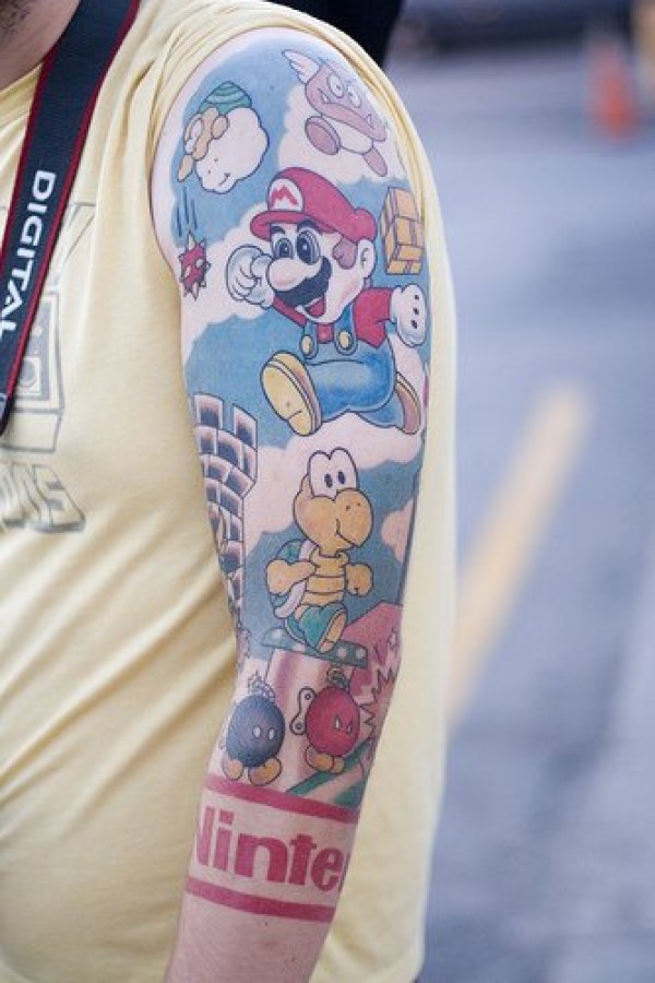 手臂鲜艳的彩色卡通马里奥主题纹身图案