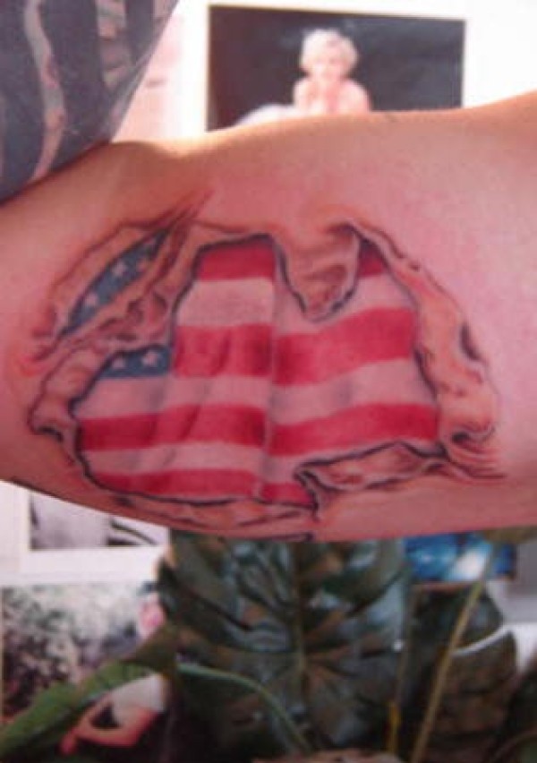 手臂美国国旗和皮肤撕裂纹身图案