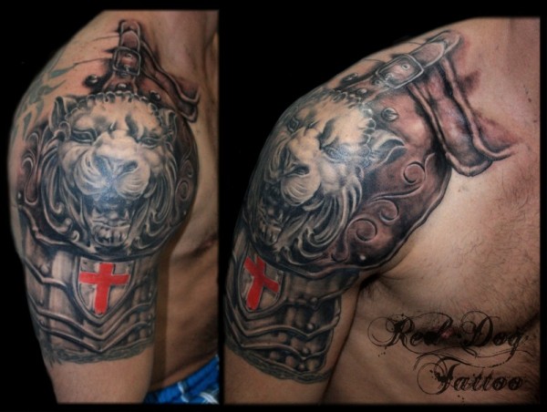 中世纪风格的彩色狮子头盔甲肩部纹身图案