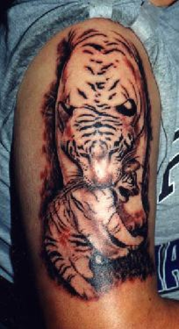 老虎与幼崽大臂纹身图案