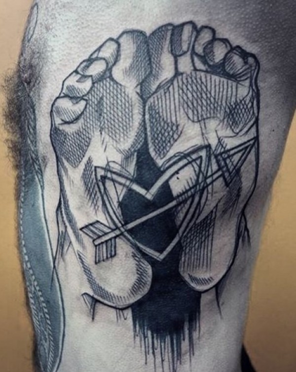 侧肋素描风格黑色线条脚印与心形箭头纹身图案