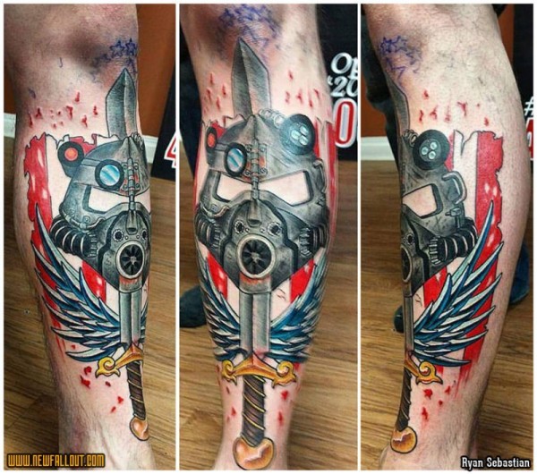 小腿彩色的机械盔甲头盔和剑纹身图案
