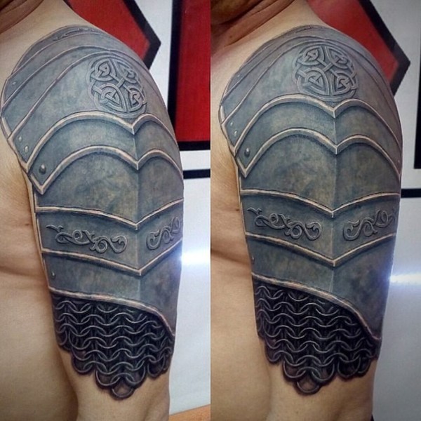 手臂彩色钢铁般的盔甲与凯尔特符号纹身图案