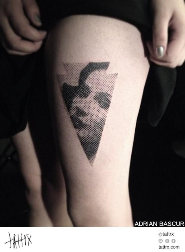 大腿点刺风格的黑色箭头和女人肖像纹身图案
