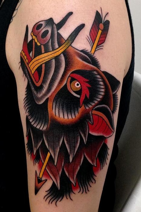 old school大臂彩色野猪与箭头纹身图案