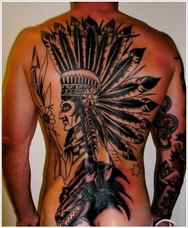 满背惊人的黑色印度部落酋长和箭花朵羽毛纹身图案
