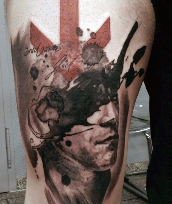 大腿神秘的黑白男子肖像与红色箭头纹身图案