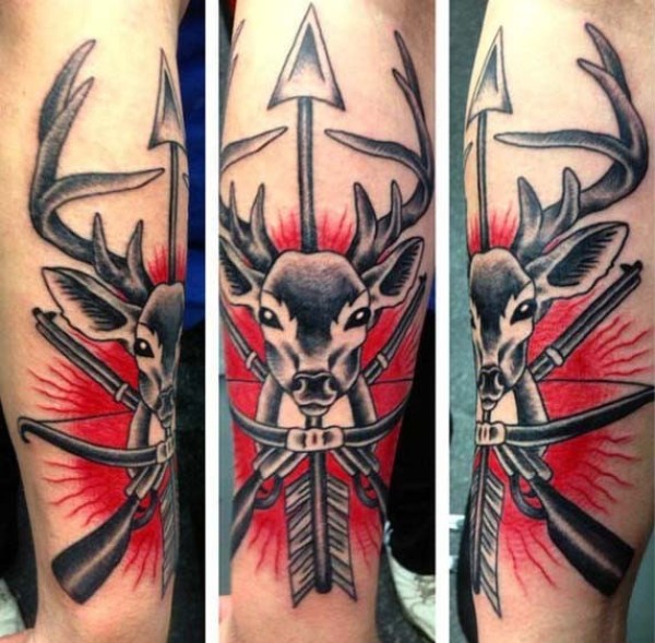 小臂彩色的鹿头和交叉步枪箭纹身图案