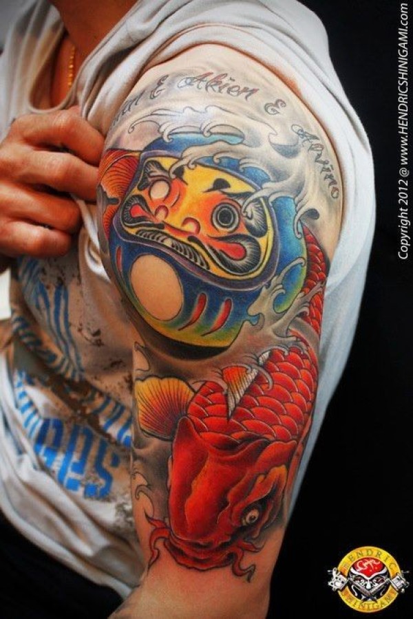 手臂色彩鲜艳的鲤鱼和达摩纹身图案