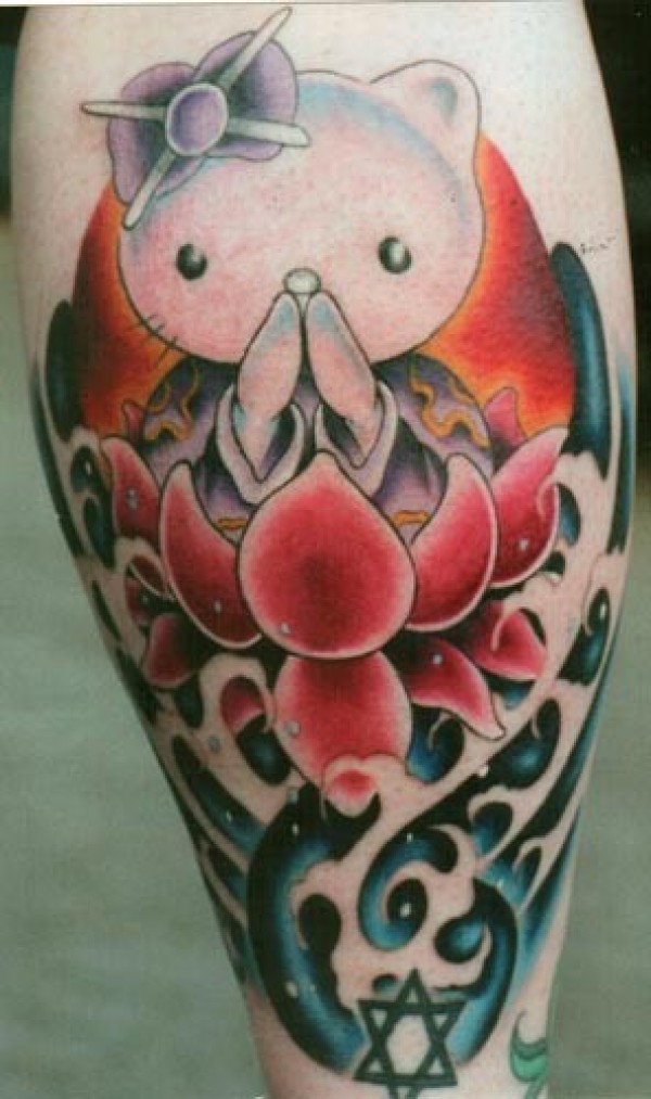 亚洲卡通风格的彩色猫与莲花纹身图案