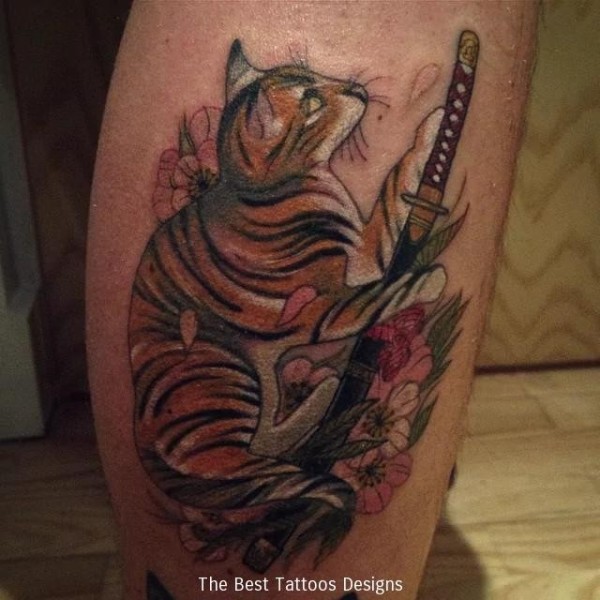 小腿彩色的亚洲虎纹猫咪与武士剑纹身图案