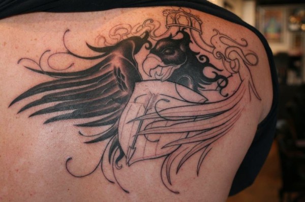 背部黑白盾牌和鸟翅膀纹身图案