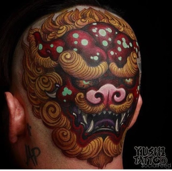 头部彩色经典的亚洲唐狮头像纹身图案