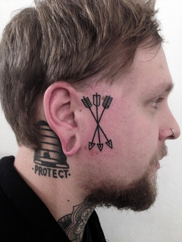 男子脸部黑色的箭头纹身图案