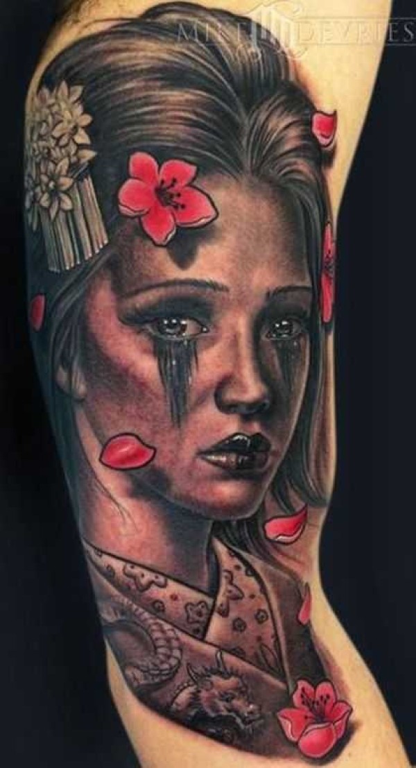 手臂彩色的亚洲艺妓肖像纹身图案