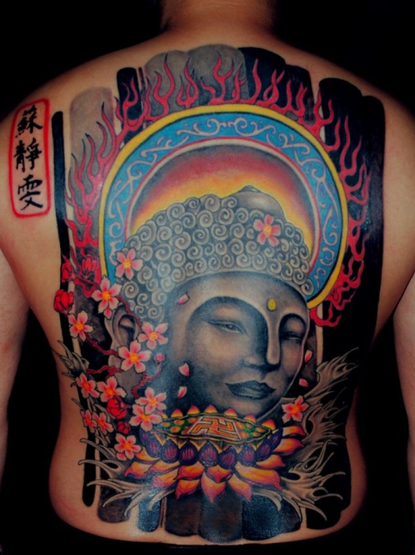 满背亚洲风格彩色如来佛祖塑像和莲花汉字纹身图案