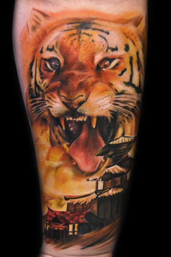 美丽的彩绘咆哮老虎和亚洲建筑纹身图案