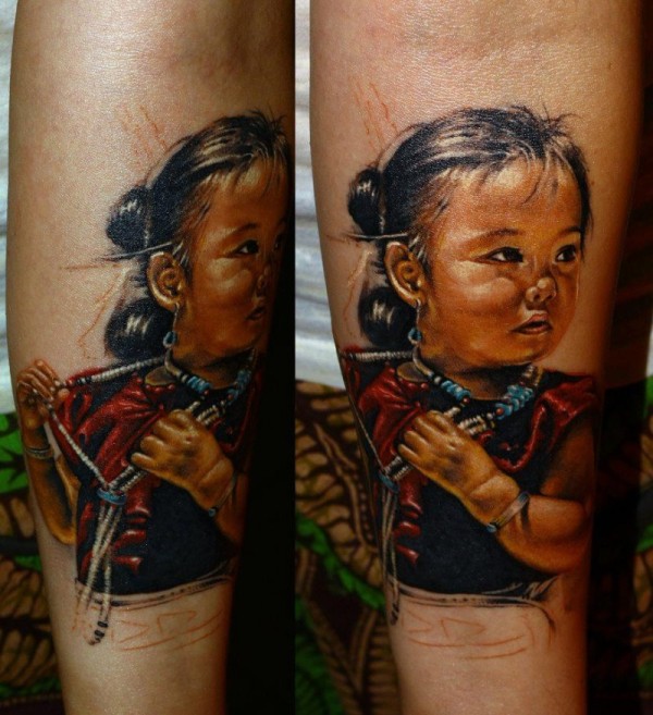 写实风格的彩色亚洲小女孩肖像纹身图案