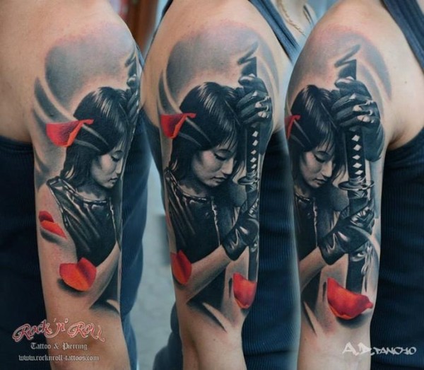 大臂彩色的亚洲女战士和剑纹身图案
