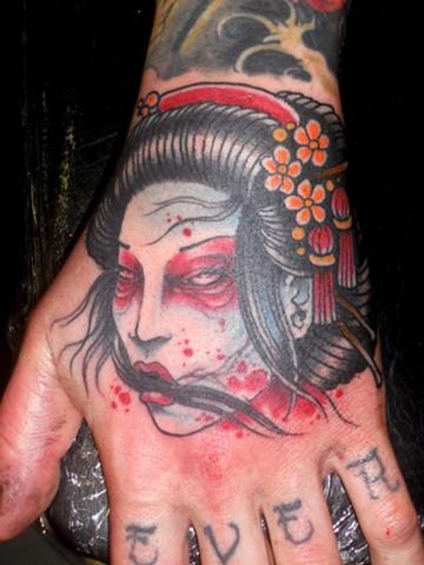old school手背亚洲风格的艺妓生首彩色纹身图案