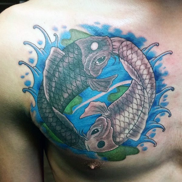胸部圆形的东方鲤鱼组合阴阳八卦纹身图案