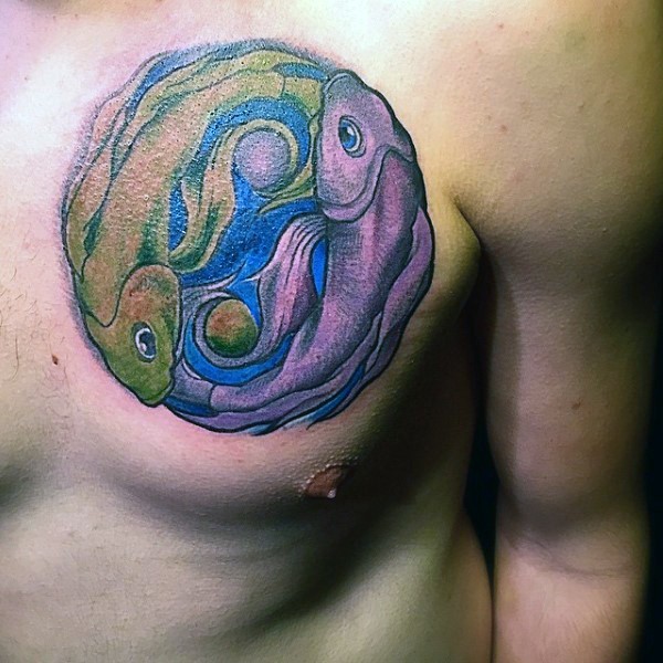 胸部彩色鲤鱼组合的阴阳八卦符号纹身图案
