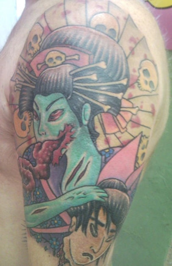 大臂亚洲的僵尸艺妓彩色纹身图案