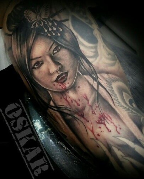手臂恐怖风格的血腥亚洲艺妓纹身图案