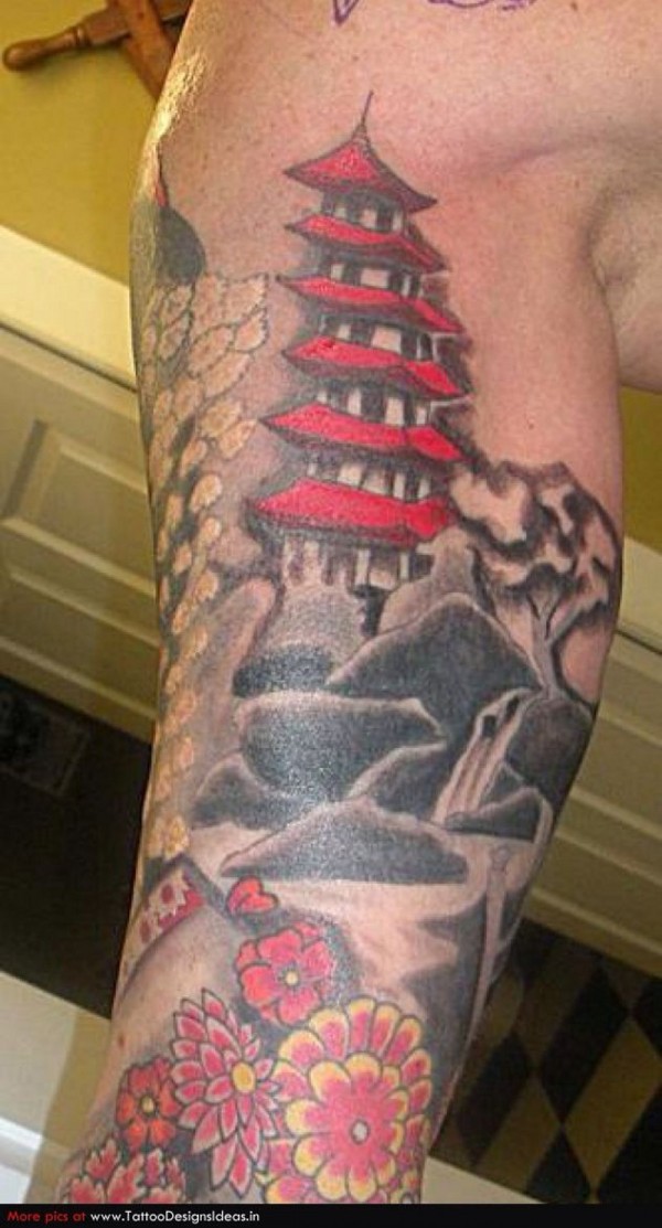 大臂亚洲风格彩色寺庙与花朵纹身图案