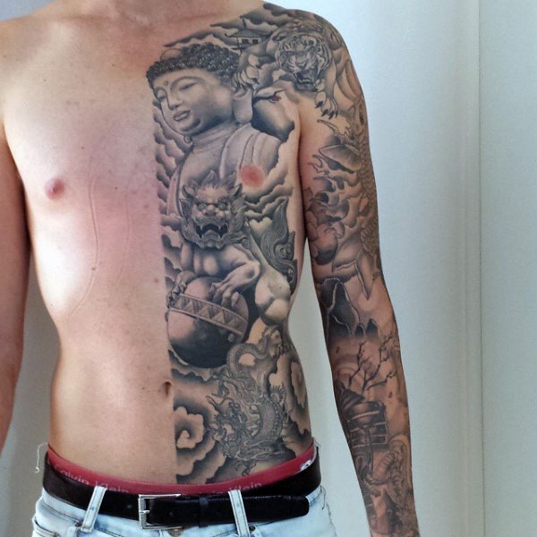 男性腹部和手臂亚洲传统黑灰佛像唐狮纹身图案