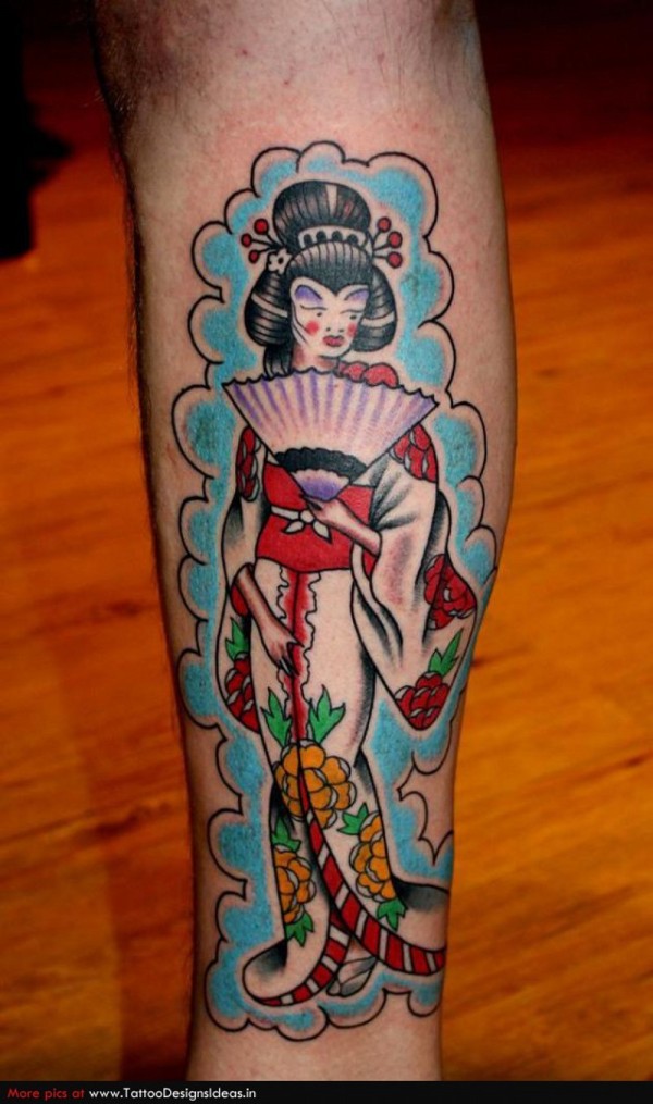 小腿彩色的亚洲艺妓画像与美丽和服纹身图案