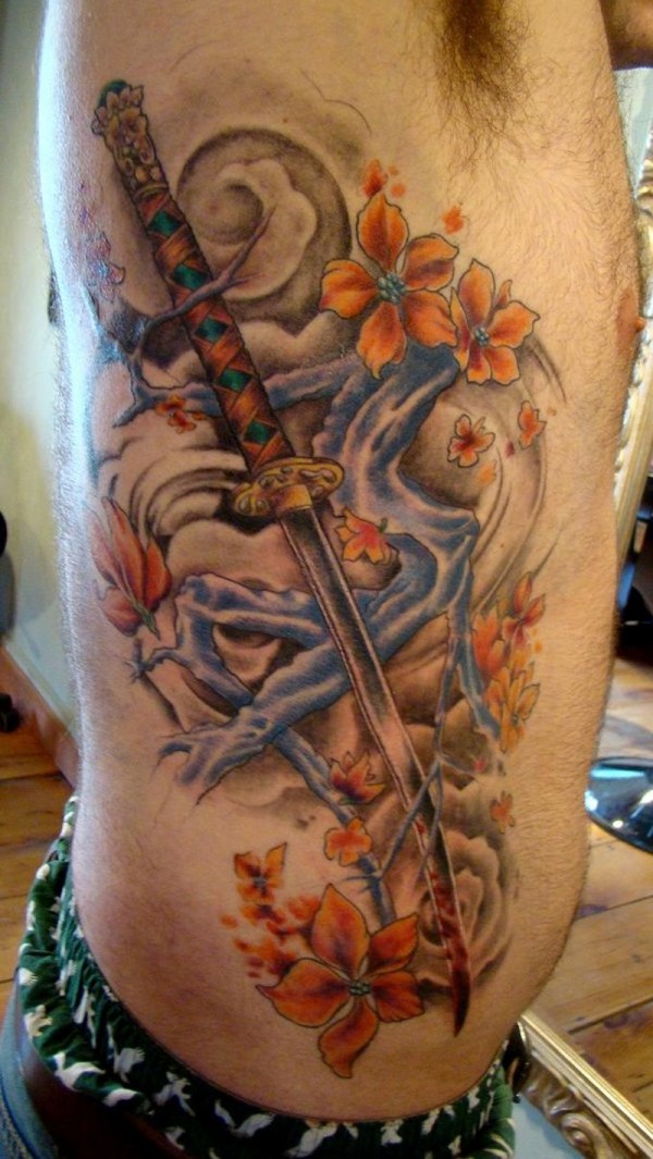 侧肋亚洲传统彩色的武士刀和花朵纹身图案