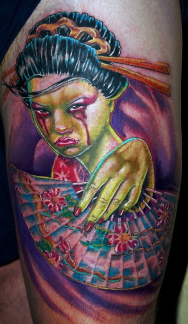 大腿五颜六色的哭泣僵尸艺妓纹身图案