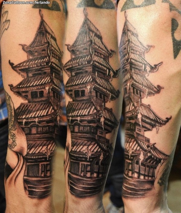 手臂古老的亚洲寺庙令人叹为观止纹身图案
