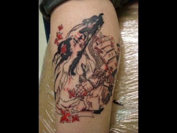 小腿彩绘的浪漫亚洲接吻情侣人像纹身图案