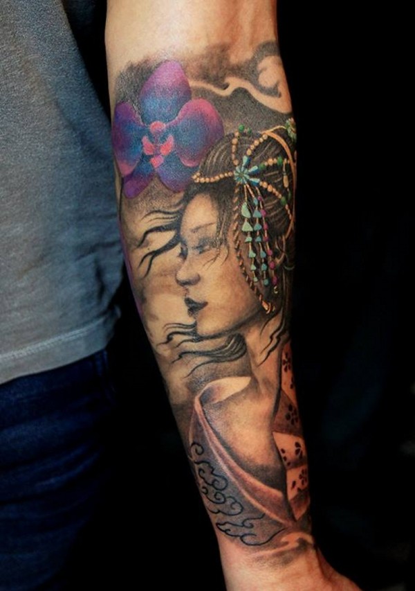 小臂美丽的女性与紫罗兰花朵纹身图案